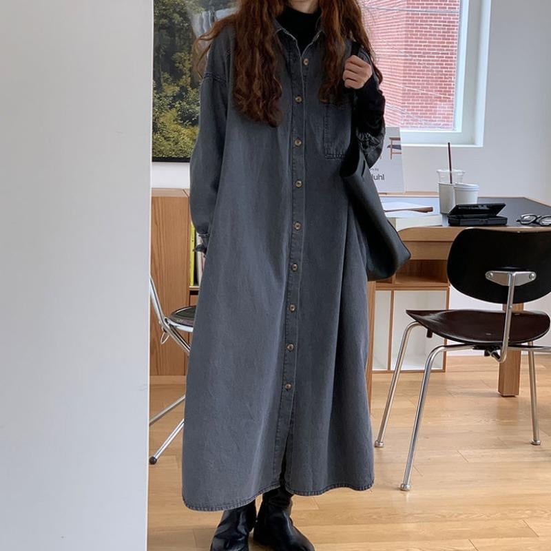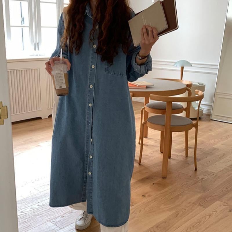 お洒落でカジュアルなシャツワンピースです。デニム素材を使用しており、着心地の良さと耐久性を兼ね備えています。長袖のデザインが季節を問わず活躍し、ロング丈でスタイルアップ効果も期待できます。ウエストを絞ったシルエットが女性らしさを引き立て、幅広いコーディネートに対応可能です。