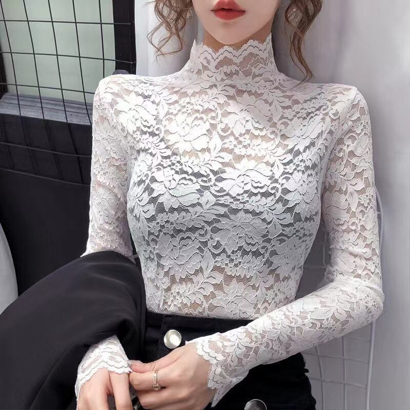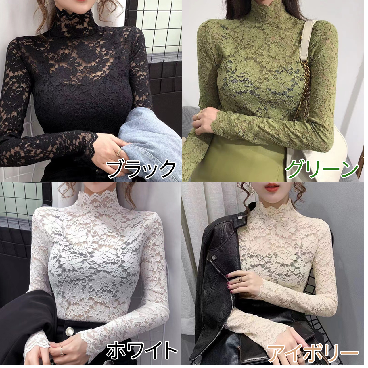 繊細な透け感が女性らしい柔らかな魅力を引き立て、ハイネックデザインが洗練された印象を添えます。