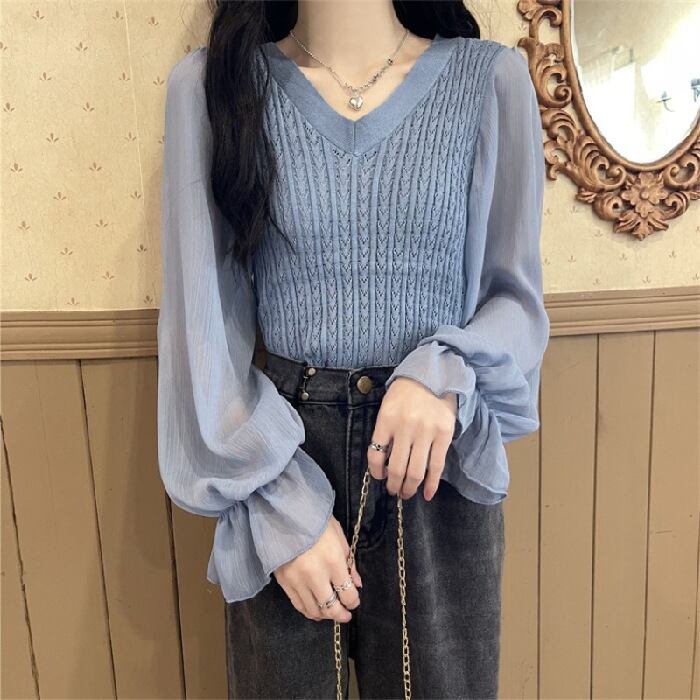 繊細なシフォンの切り替えと、さりげないフリル袖が上品な華やかさを添える一着。