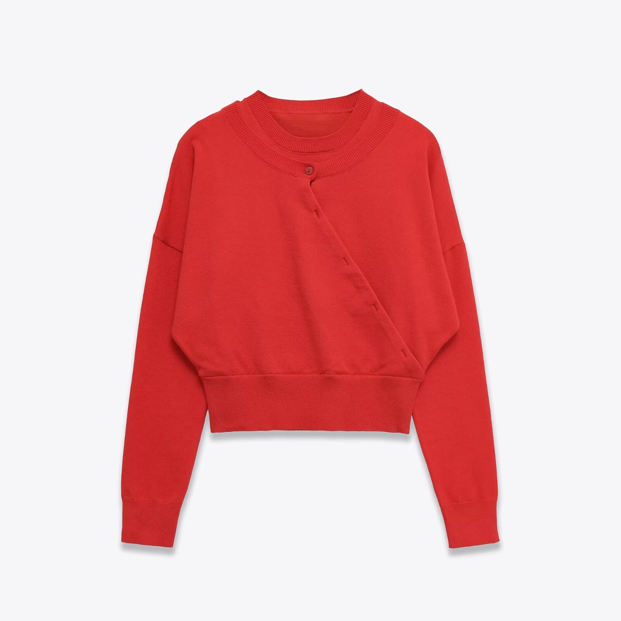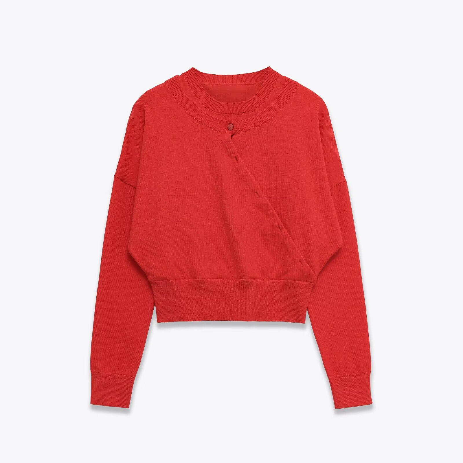 レイヤードデザイン クルーネックニット レッドです!トレンド感満載のレイヤードデザインが魅力で、スタイリングの幅を広げる一着。柔らかなニット素材を使用し、肌触りが良く、秋冬のコーディネートにぴったりなアイテムです。