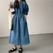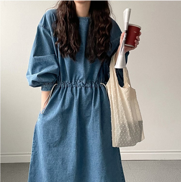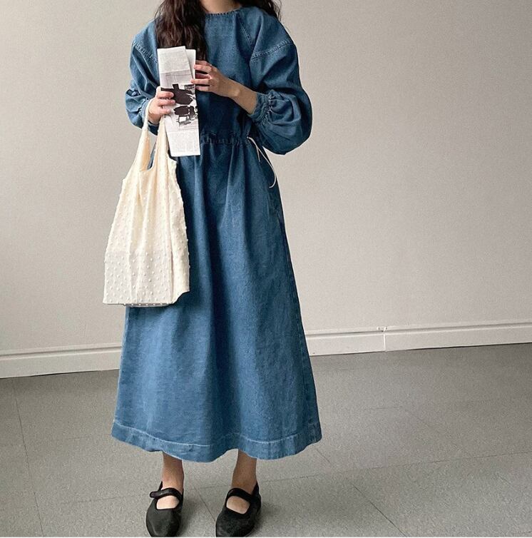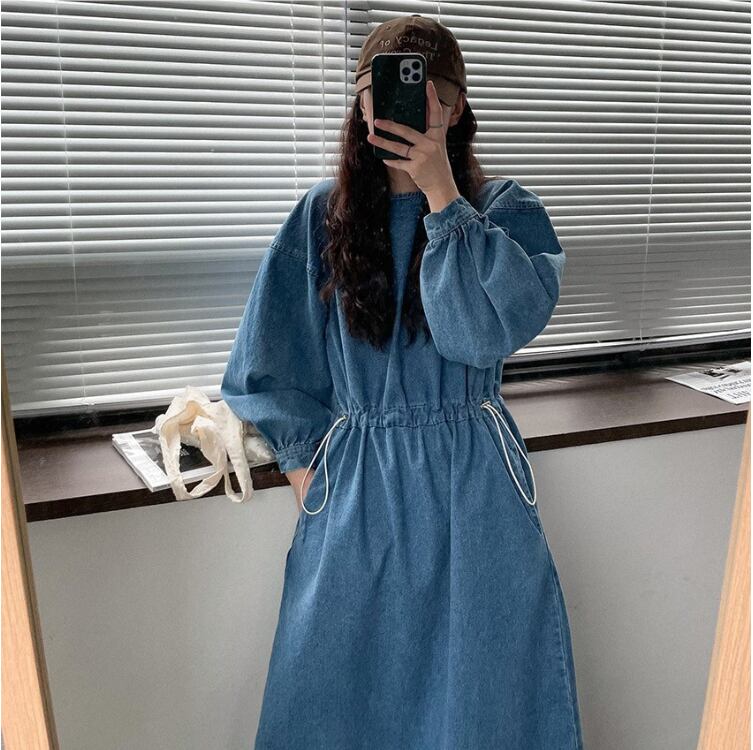 レディース 韓国風 ルーズシルエット Aラインデニムワンピース(ウエスト調整可)です!程よいルーズシルエットが特徴的で、柔らかなデニム素材が心地よく、さまざまなシーンで活躍する一着です。ウエスト調整が可能なので、自分のスタイルに合わせた着こなしが楽しめます!